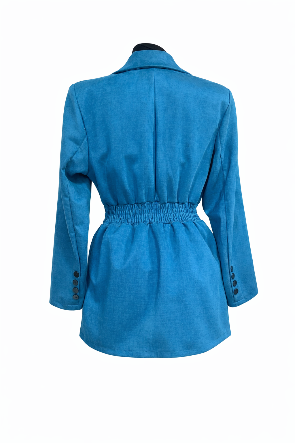 Marynarka w kolorze morskim, wiązana w talii. Wyprodukowana we Włoszech. Długość całkowita 75 cm, szerokość 50 cm x 2 cm.
