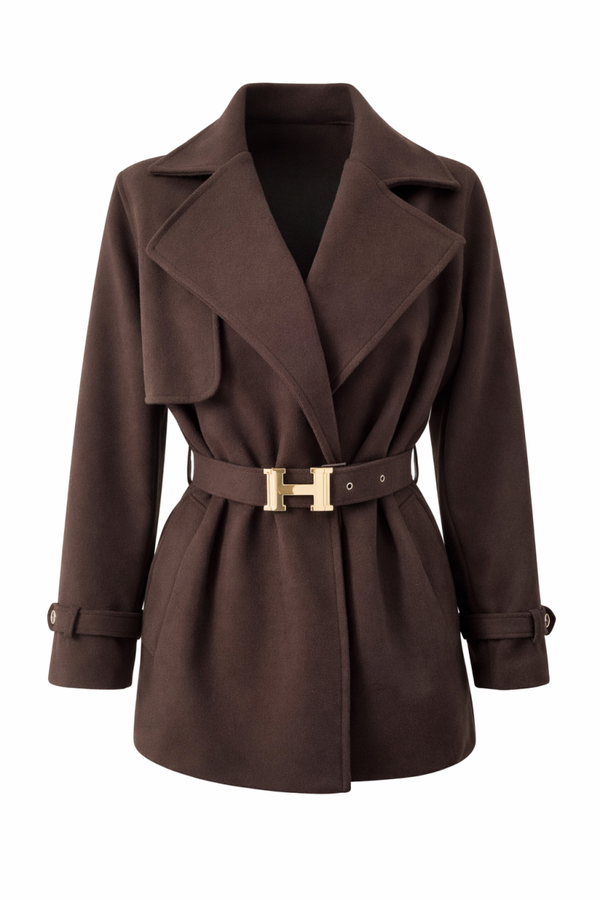 Elegancki, taliowany płaszcz w kolorze głębokiego czekoladowego brązu. Model ma klasyczny, dwurzędowy krój z szerokimi klapami i subtelnym dekoltem w serek. Zapinany na guziki, dodatkowo podkreślony paskiem w tym samym kolorze z efektowną, złotą klamrą w kształcie litery „H”, która nadaje całości luksusowego charakteru.