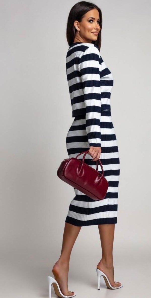 Komplet utrzymany jest w klasycznym czarno-białym kolorze w poziome pasy, który optycznie wysmukla sylwetkę i nigdy nie wychodzi z mody. Dzianina o wyraźnej, prążkowanej strukturze pięknie pracuje na ciele, podkreślając figurę.