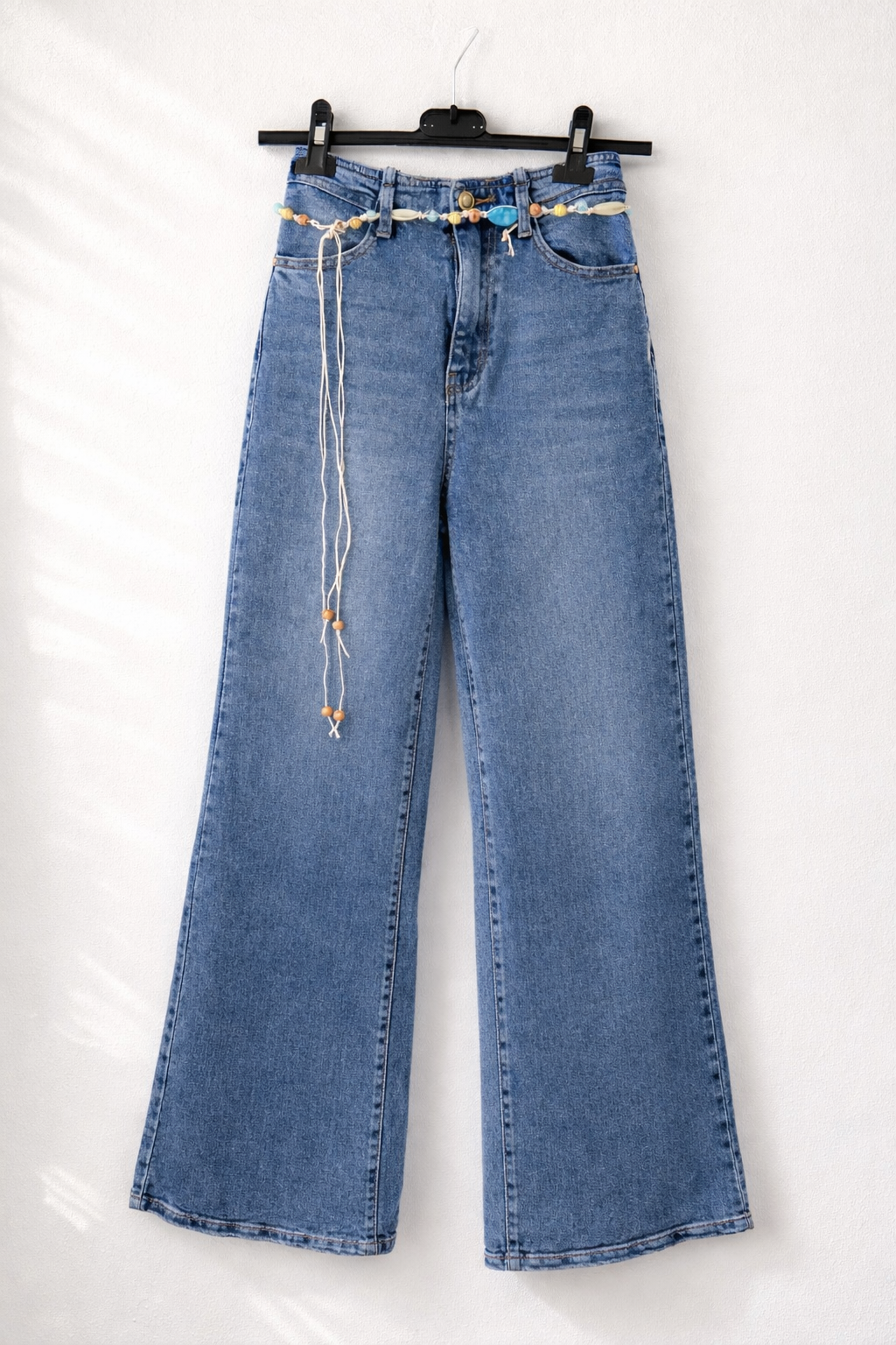 - Ozdobny pasek z koralikami (turkusowe, beżowe i drewniane akcenty) – nadaje stylu boho.