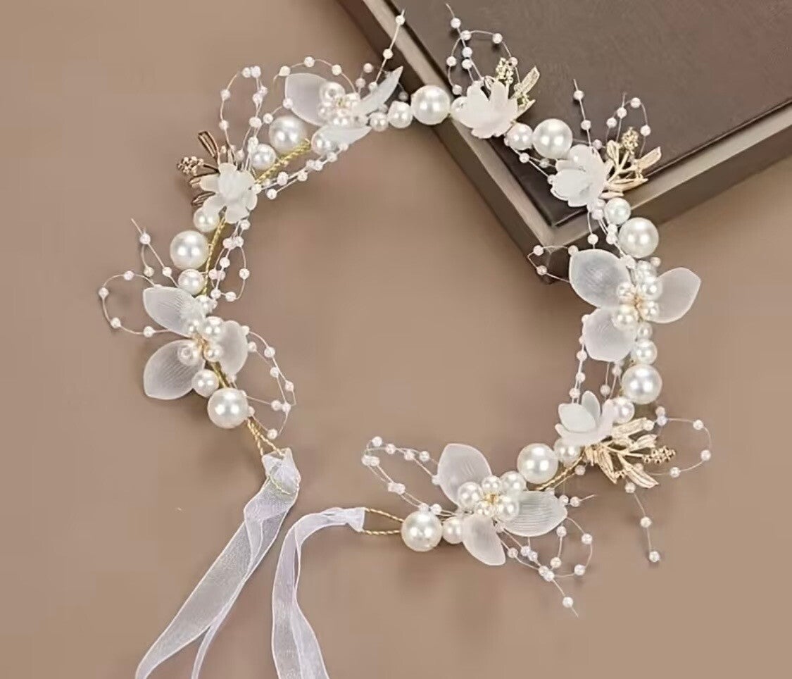 Piękny, subtelny wianek. Regulowany. Całość ozdobiona perełkami.
