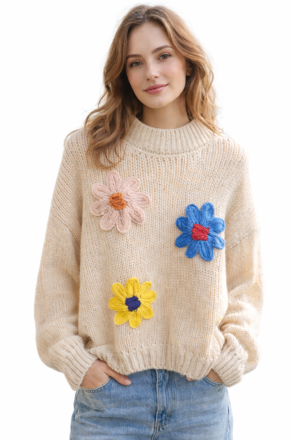 Kwiaty mają fakturę przypominającą ręcznie wyszywane lub naszywane elementy, co dodaje swetrowi oryginalności i lekko artystycznego, wesołego charakteru. Całość łączy klasyczną formę z zabawnym, kolorowym akcentem.