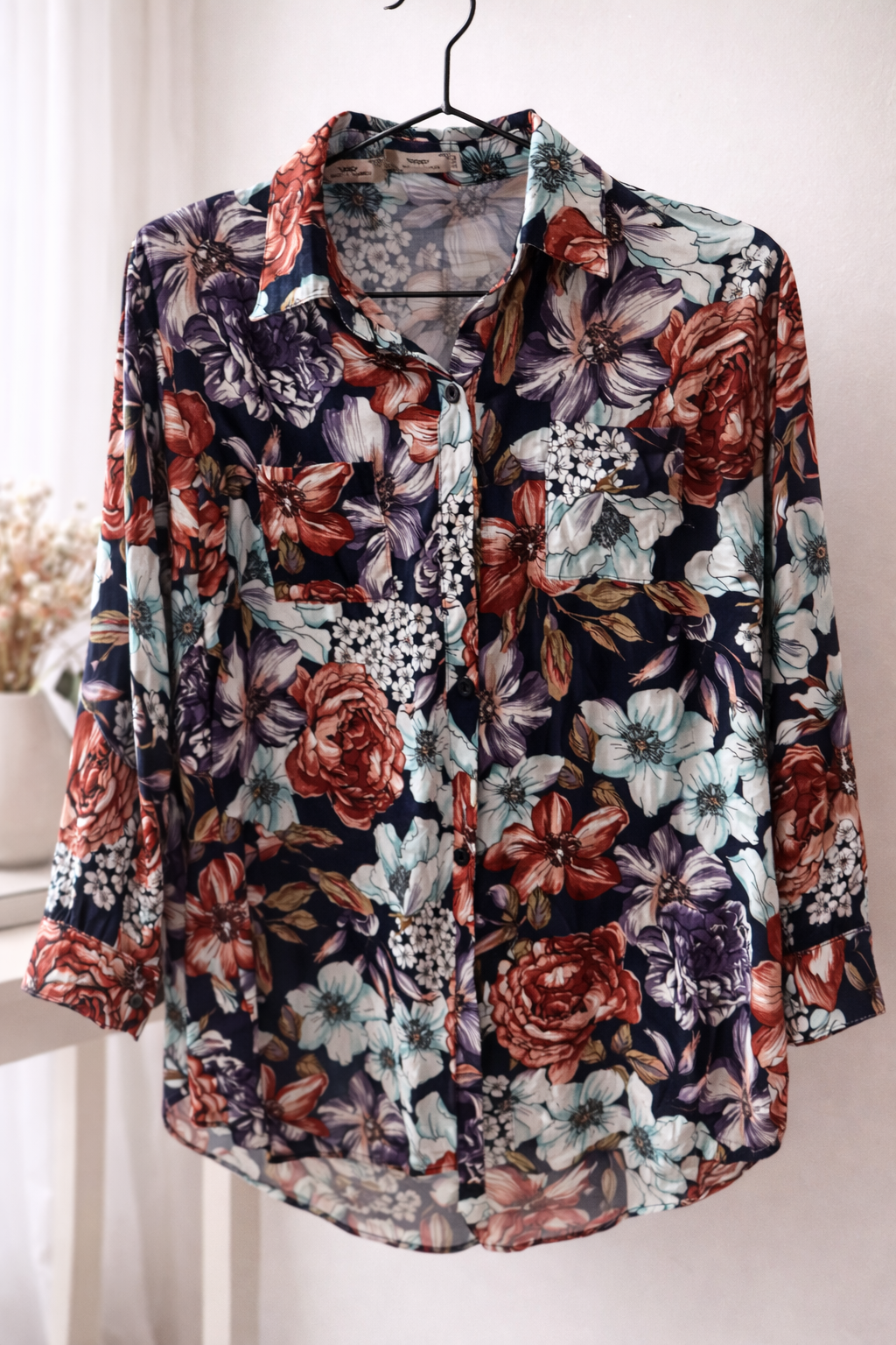 Ta koszula to elegancki, kobiecy model w efektowny, kwiatowy print na granatowym tle.