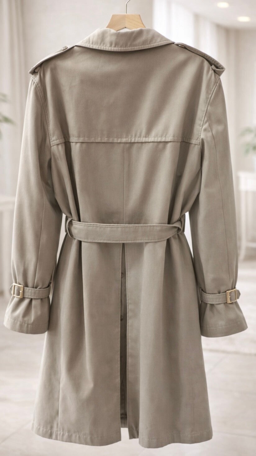 Wyjątkowy trencz o wymiarach 101 cm długości i obwodzie 50 cm x2. Jest wykonany z grubej tkaniny. Pondaczasowy i elegancki.