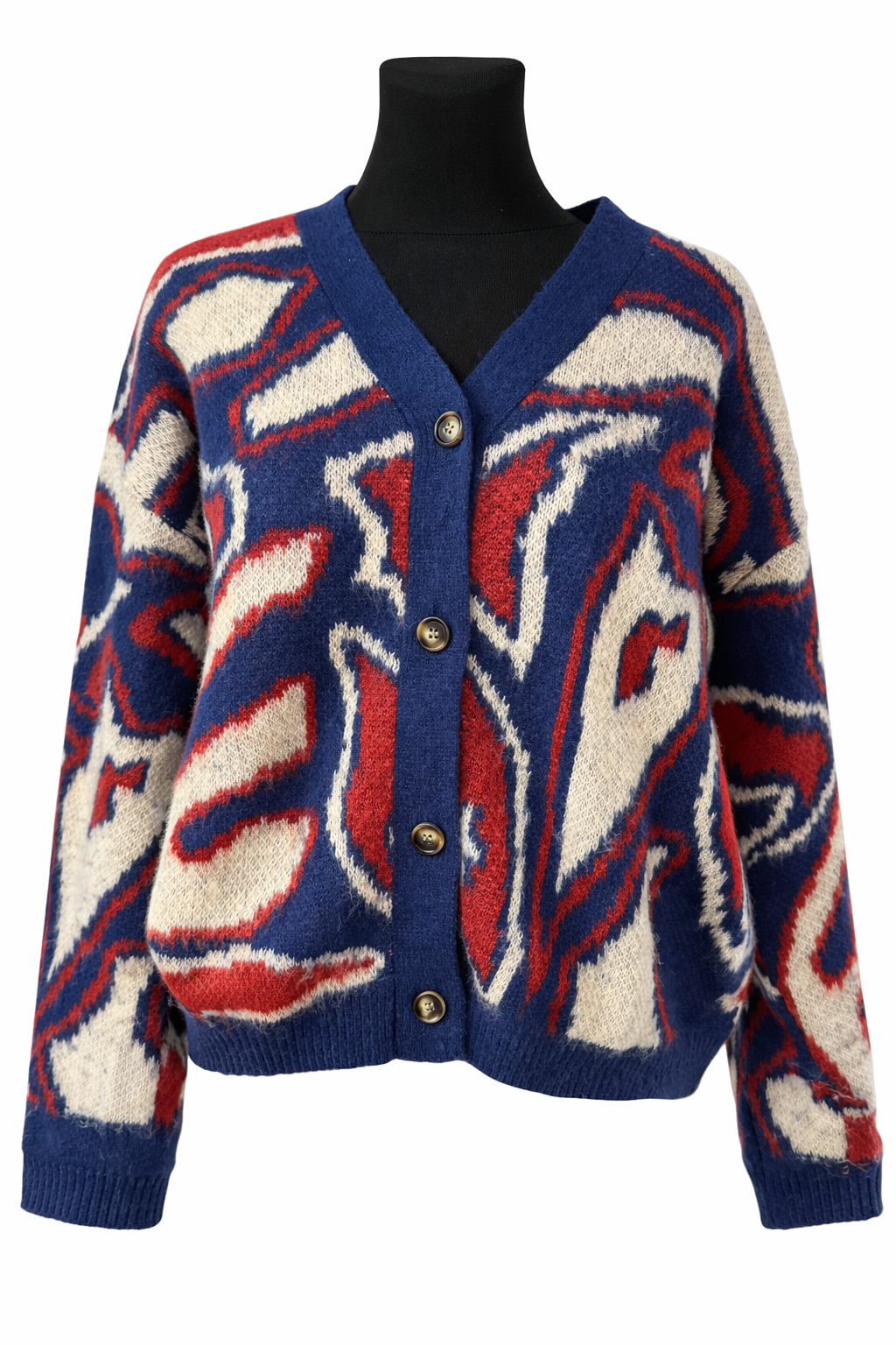Stylowy, miękki kardigan zapinany na guziki w wyrazisty, abstrakcyjny wzór. Połączenie granatu, czerwieni i koloru ecru nadaje mu charakteru i sprawia, że świetnie ożywia każdą stylizację.