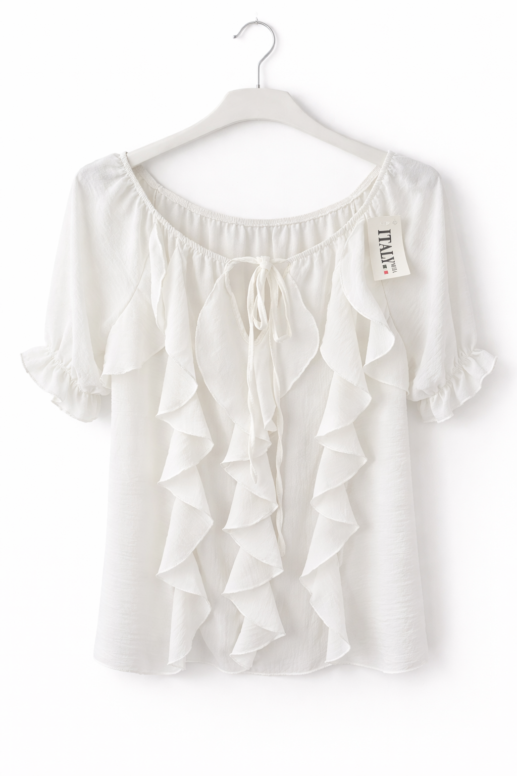 Elegancka i bardzo kobieca bluzka w kolorze klasycznej bieli. Model z szerokim, lekko marszczonym dekoltem (możliwość noszenia jako hiszpanka), wiązaniem z przodu oraz efektownymi falbanami na całej długości. Rękaw 3/4 zakończony delikatną falbanką.