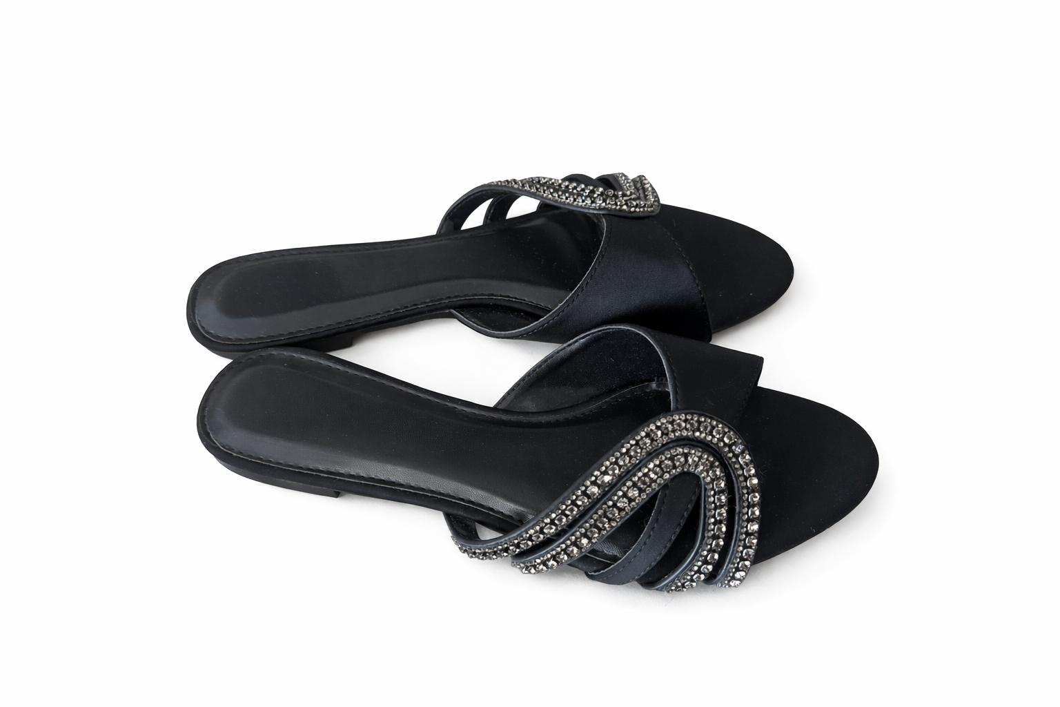 Eleganckie czarne klapki damskie z ozdobnymi cyrkoniami