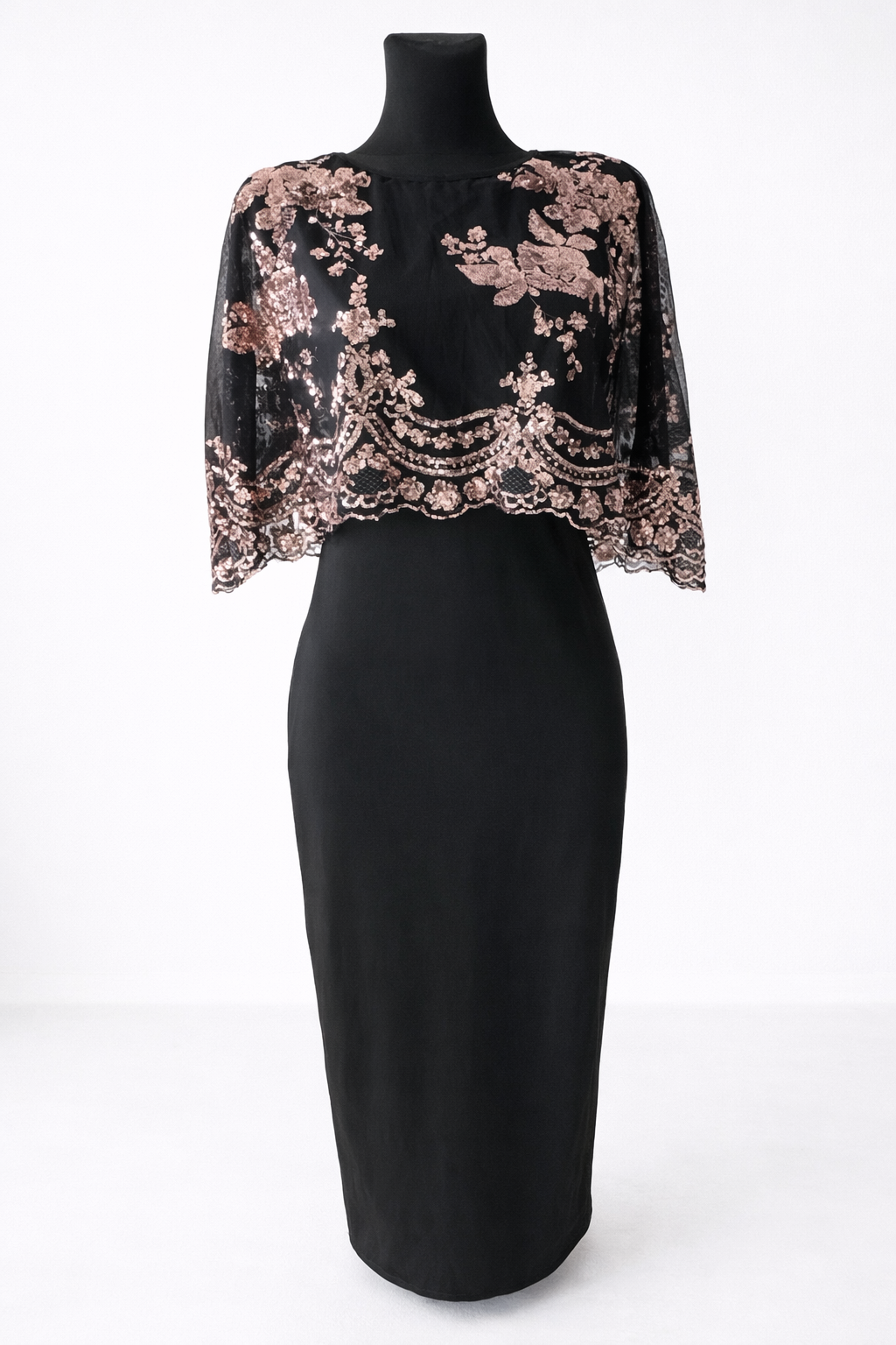 Największym atutem sukienki jest ozdobna narzutka z subtelnym, kwiatowym wzorem w odcieniu różowego złota. Lekko rozszerzane rękawy typu kimono nadają całości lekkości i elegancji, tworząc efektowny, warstwowy look.