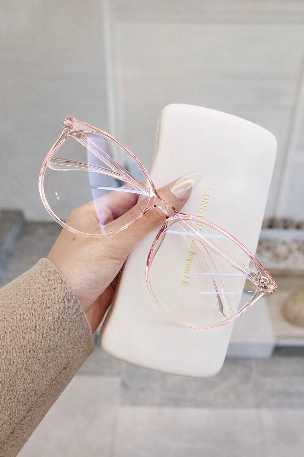 Stylowe okulary w subtelnym, różowym odcieniu, które łączą nowoczesny wygląd z lekkością i elegancją. Transparentna oprawka dodaje im delikatności, dzięki czemu pasują do każdej stylizacji – od codziennych po bardziej eleganckie.